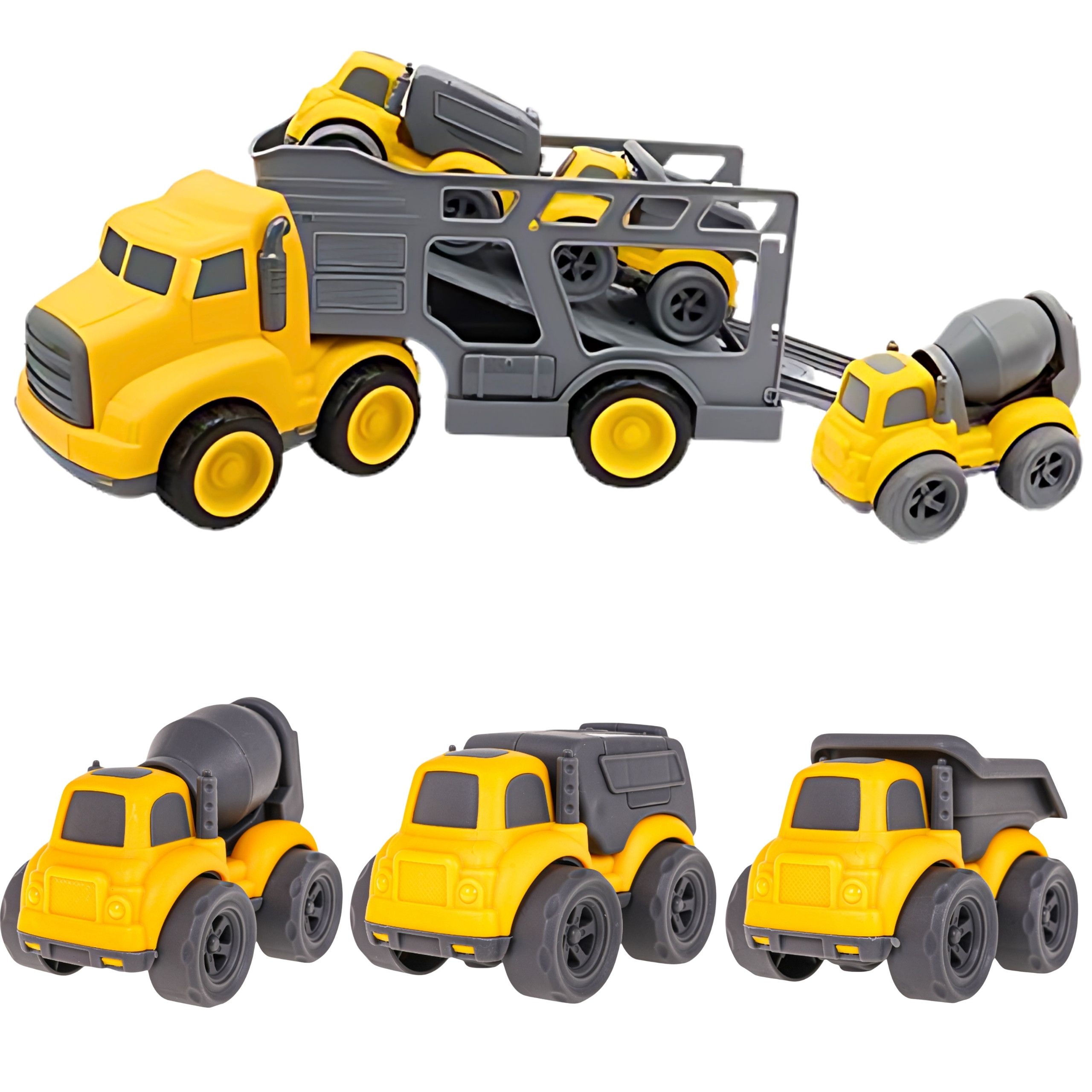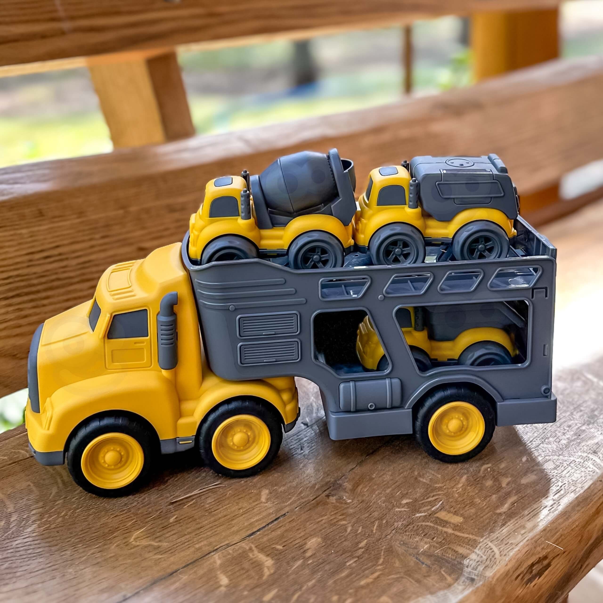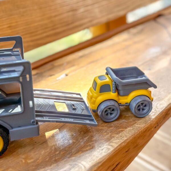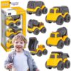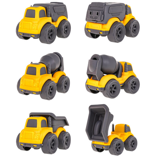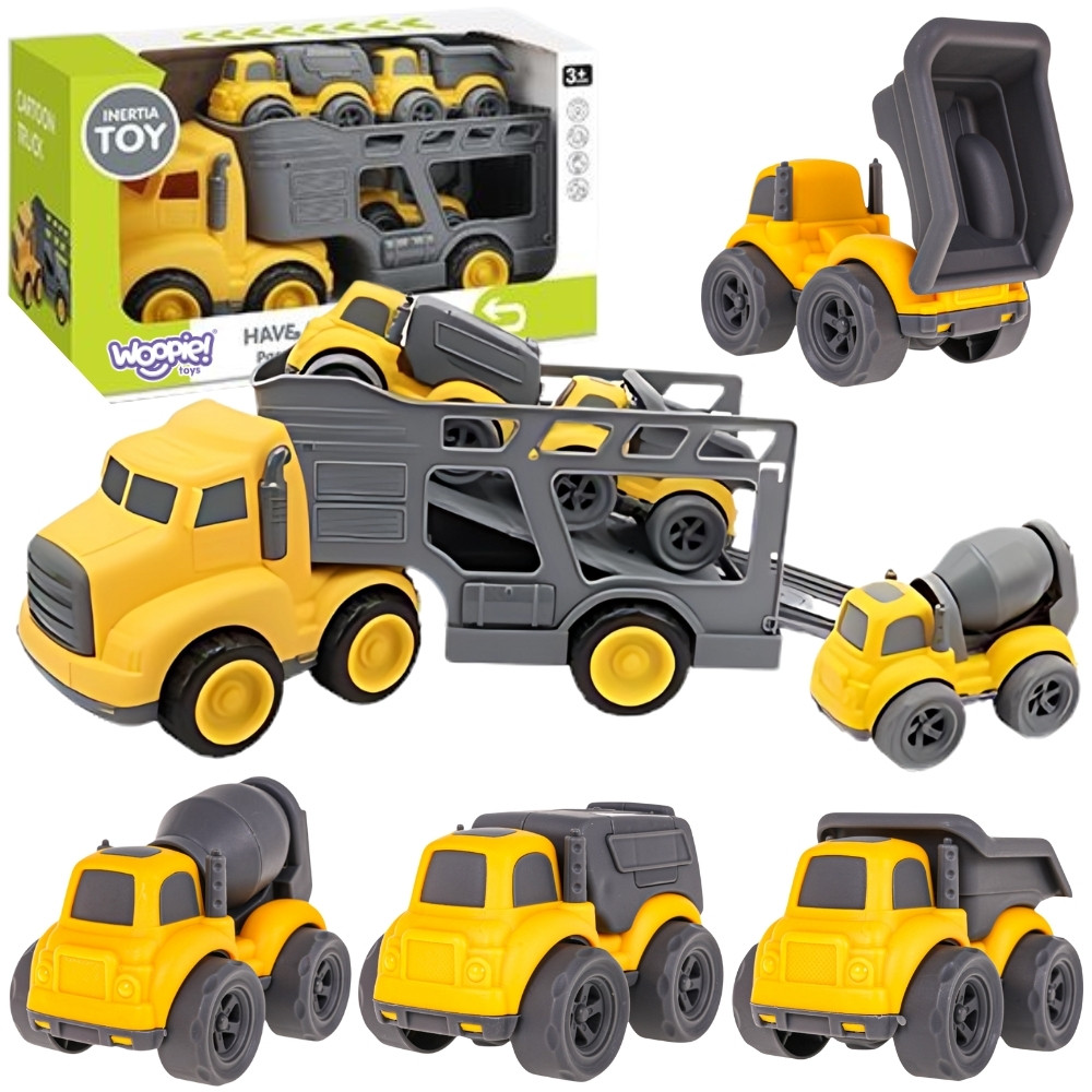 Wkrocz na plac budowy z niezwykłym zestawem samochodów budowlanych od marki Woopie! Duża ciężarówka z lawetą przewozi aż trzy mniejsze pojazdy: wywrotkę, betoniarkę i śmieciarkę. Każdy z nich wyposażony jest w ruchome elementy, które sprawiają, że zabawa staje się jeszcze bardziej realistyczna i angażująca. Zestaw zachwyca solidnym wykonaniem, żywymi kolorami i dbałością o detale, gwarantując długie godziny kreatywnej rozrywki dla każdego małego budowniczego.