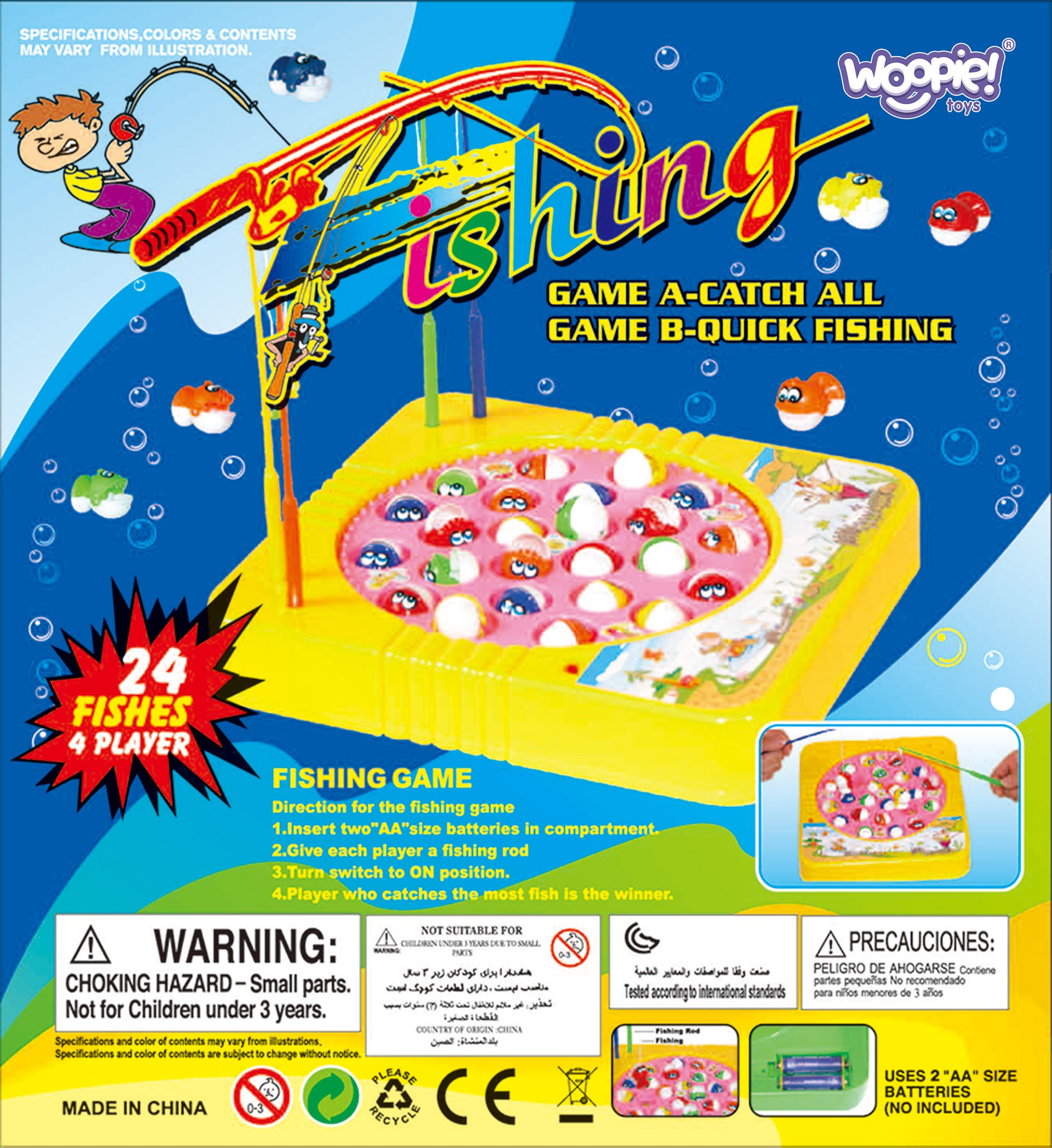 - – Zestaw zawiera: 4 kolorowe wędki, planszę do gry, 24 ryby