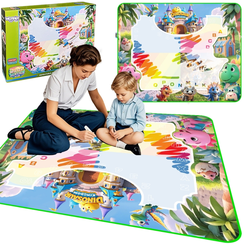 Ta magiczna, duża mata wodna od marki Woopie to idealny sposób na kreatywną zabawę bez bałaganu. Wystarczy napełnić pisaki wodą, a kolory zaczną pojawiać się na macie jak za dotknięciem czarodziejskiej różdżki! Gdy mata wyschnie, rysunek znika, dzięki czemu zabawę można zacząć od nowa. To wspaniałe rozwiązanie, które pozwala dziecku rozwijać zdolności artystyczne bez ryzyka zabrudzenia ubrań, mebli czy ścian. Mata z motywem dinozaurów i zamku wprowadzi malucha do fantastycznego świata rysowania. W zestawie znajdują się różnorodne akcesoria, takie jak pisaki, które można wykorzystać do malowania, oraz gąbkowe stemple, które pozwalają na tworzenie dodatkowych kształtów. Duży rozmiar maty zachęca do wspólnej zabawy z rodzeństwem lub rodzicami. Produkt jest bezpieczny i wielorazowego użytku.