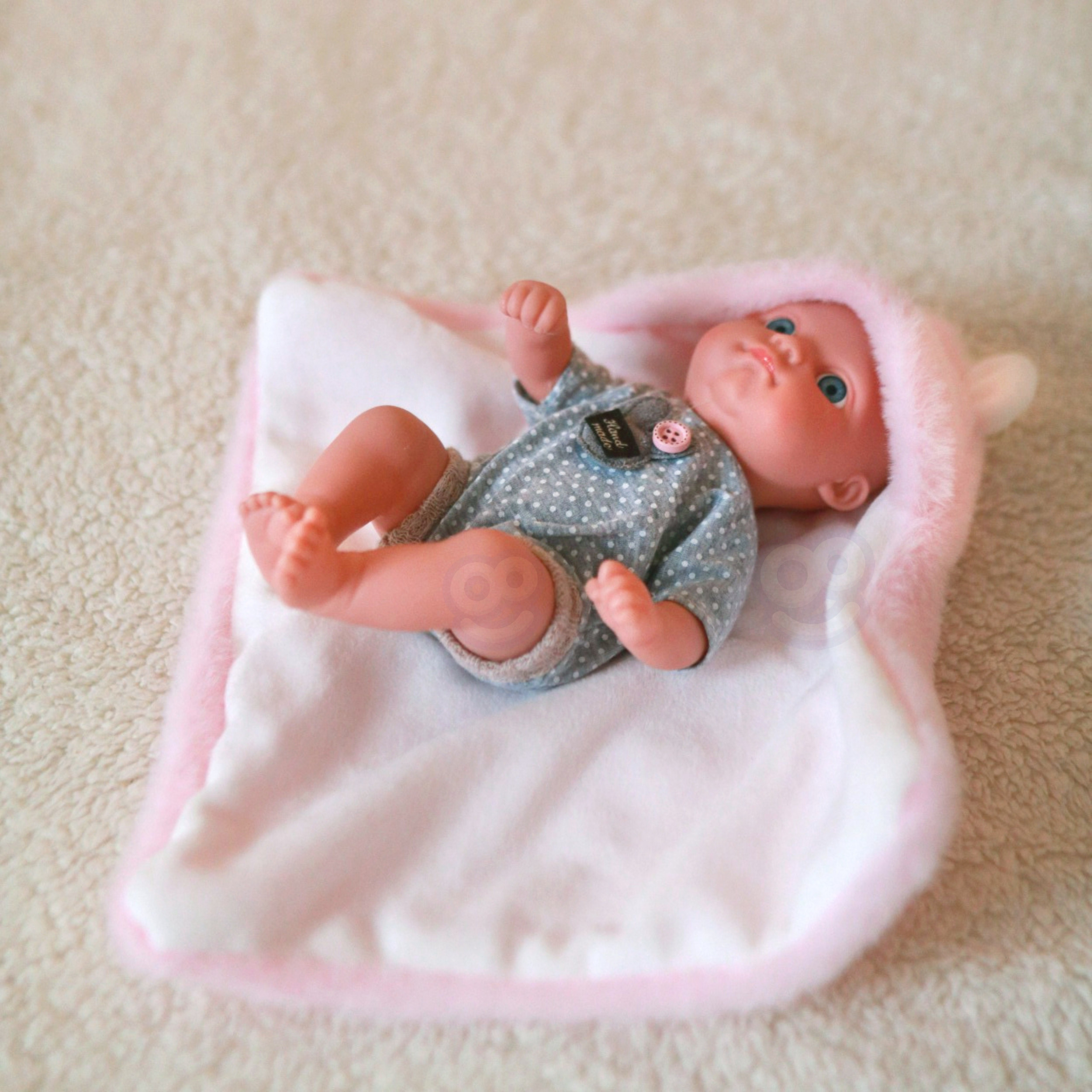 Ta urocza laleczka ma buzię, która zawsze jest gotowa na uśmiech i spojrzenie pełne ciepła. Jej realistyczne rączki, stópki i buzia i reszta ciała wykonane są z miękkiej gumy, ubrana w uroczy rampers hand made, idealna do przytulania. Bobas wyposażony jest w różowy kocyk, który zamienia się w namiot, nosidełko lub po prostu idealne okrycie na zimne dni. Dodatkowo, kocyk z uszkami sprawia, że lalka staje się jeszcze bardziej urocza i niepowtarzalna.