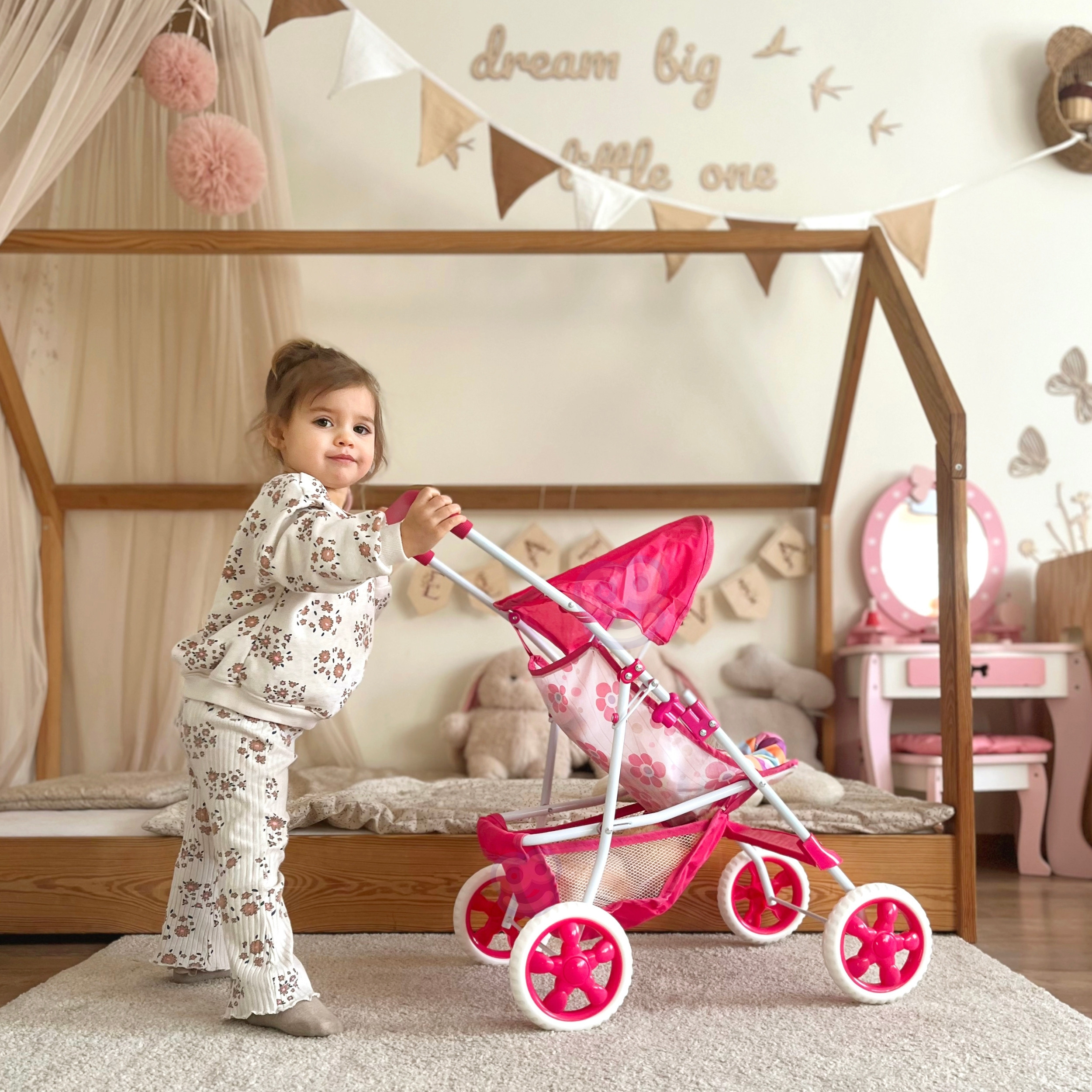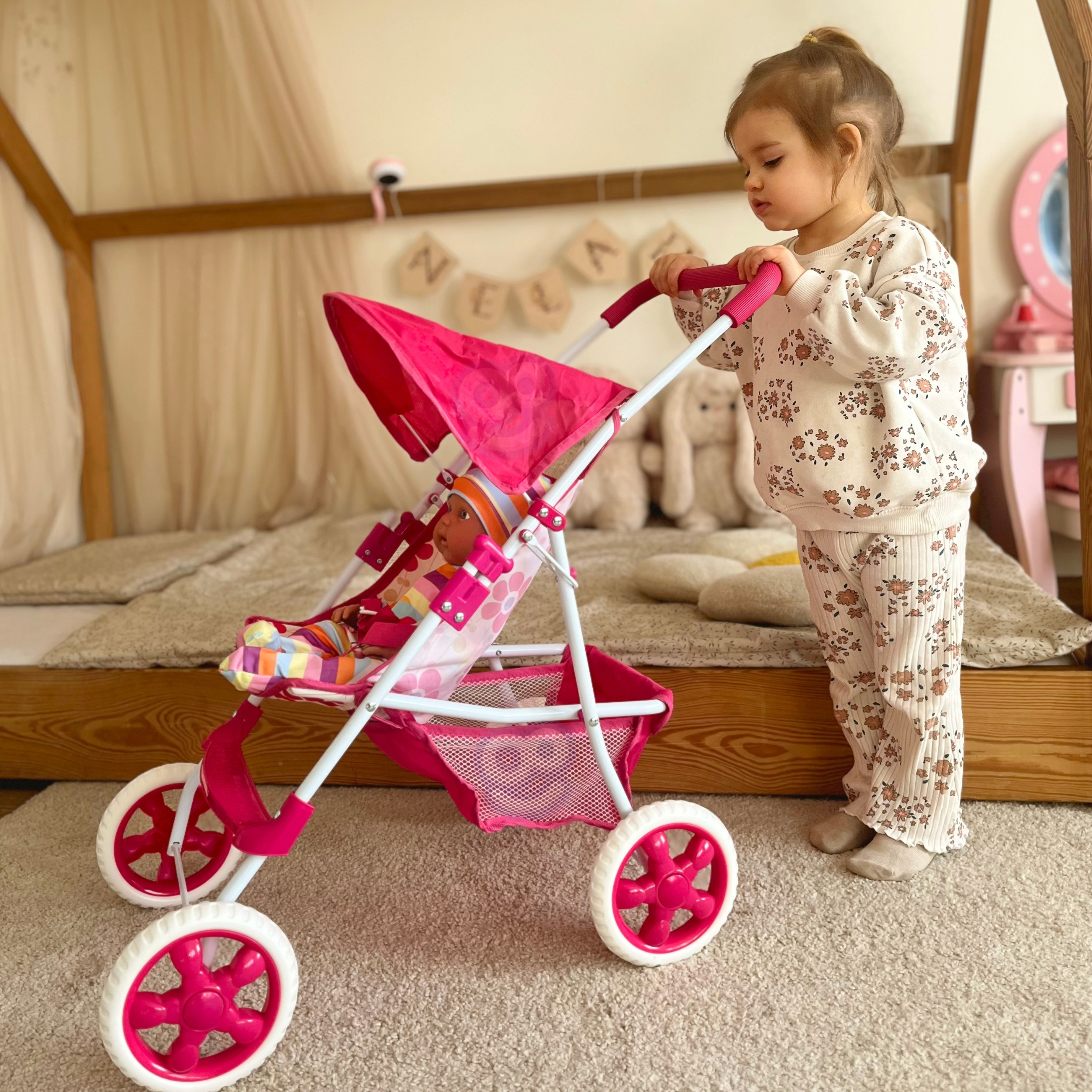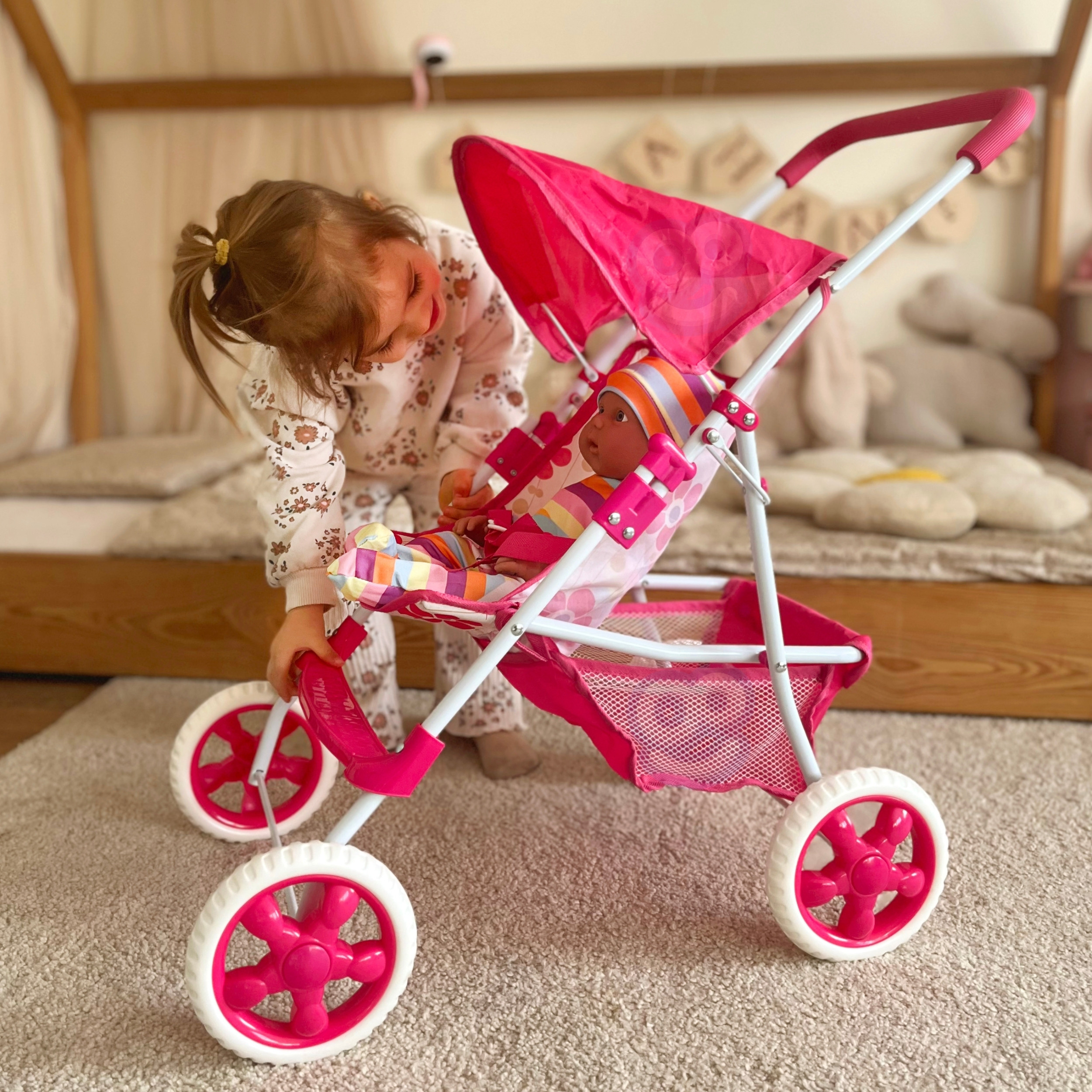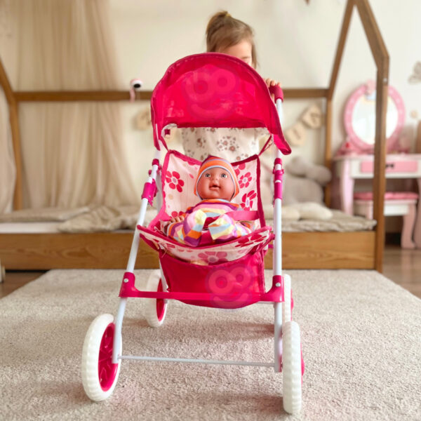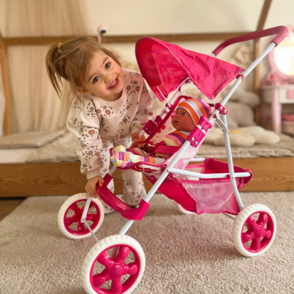 Wózek dla lalek marki Woopie to idealny wybór dla każdej małej miłośniczki zabawy w dom. Wyróżnia się lekką, ale bardzo stabilną ramą, co zapewnia wygodę i bezpieczeństwo podczas użytkowania. Wyposażony w podnóżek, budkę chroniącą przed słońcem, pasy bezpieczeństwa oraz praktyczny koszyk na drobiazgi, gwarantuje pełną funkcjonalność i komfort. Dodatkowo posiada miękką rączkę, która ułatwia prowadzenie, oraz ciche, przyczepne piankowe koła, idealne zarówno do domu, jak i na spacer. Po zakończonej zabawie wózek można łatwo złożyć, co pozwala zaoszczędzić miejsce podczas przechowywania. Stylowy design czyni go wyjątkowym dodatkiem do każdej lalki.