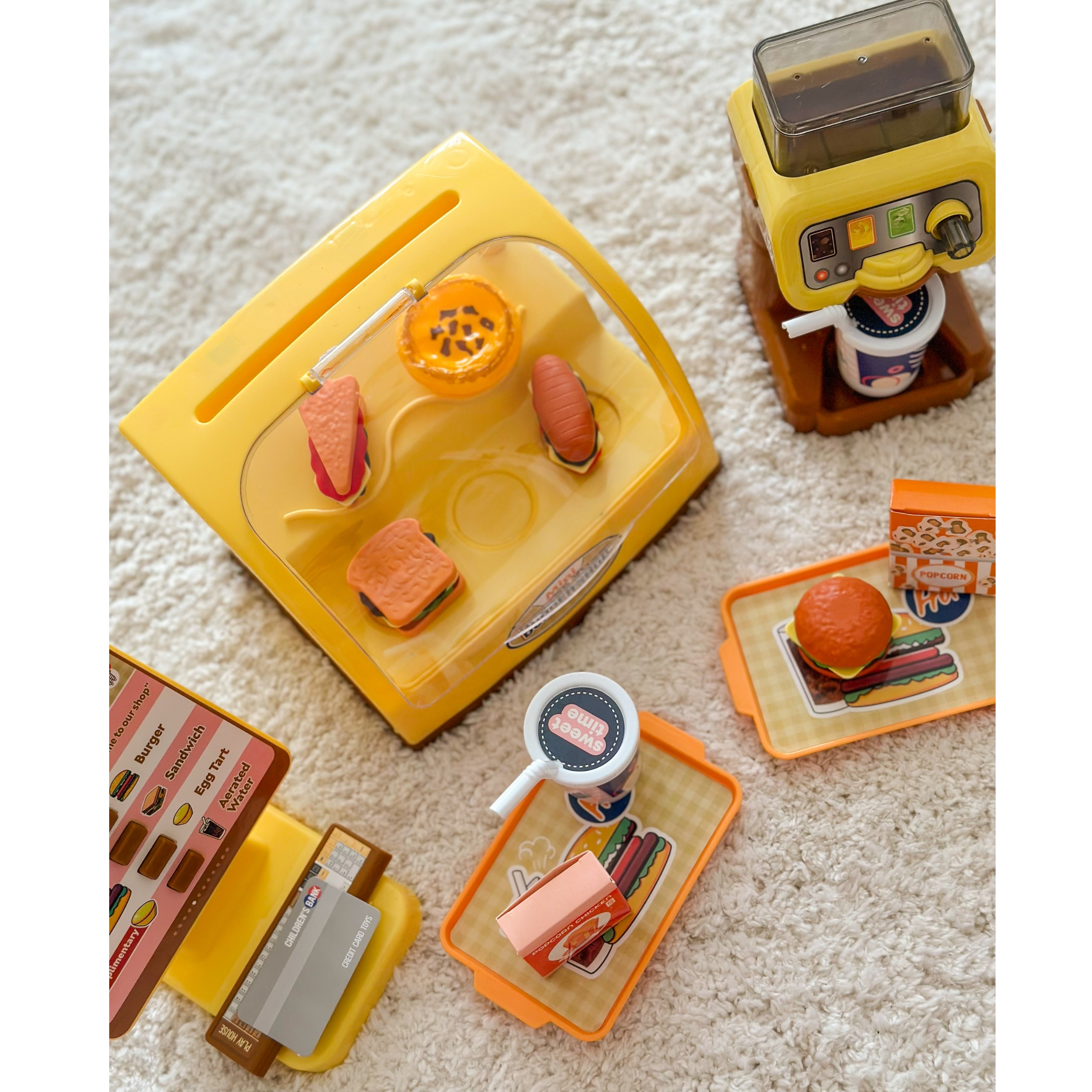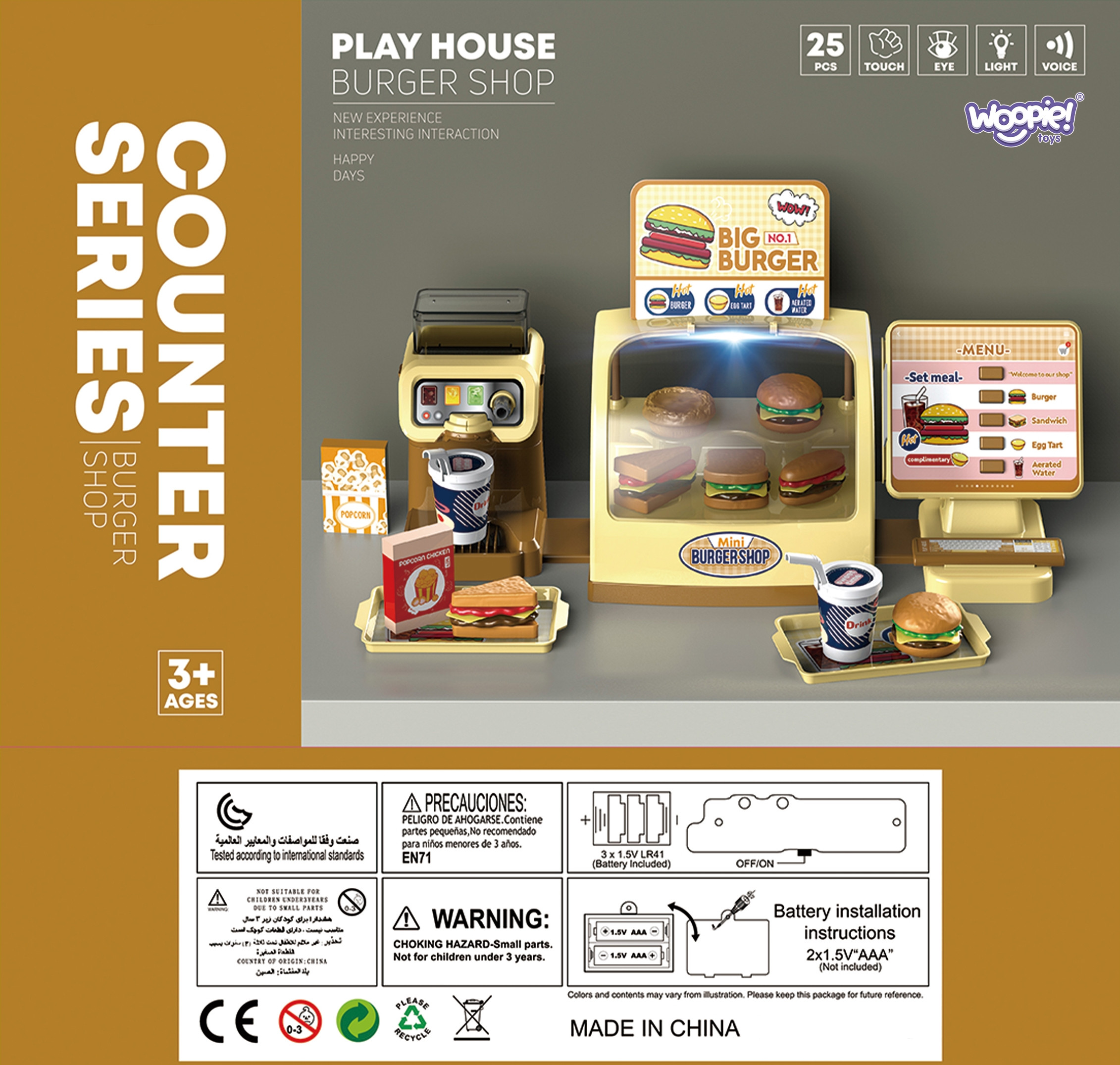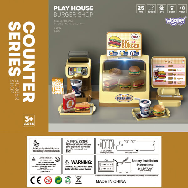 Mini Burger Shop „BIG BURGER” od marki WOOPIE to wspaniały zestaw do zabawy. Możemy obsługiwać Klientów, którzy wybierają dania prosto z oświetlonej lady! Posiada ekran z przyciskami po naciśnięciu których sklep oferuje nam efekty dźwiękowe! Możemy wlać wodę do dystrybutora, i nalewać ją do specjalnie przeznaczonych do tego kubków ze słomką. Zestaw rozwija zdolności manualne, wyobraźnię, kreatywność oraz zdolności samodzielnego myślenia.