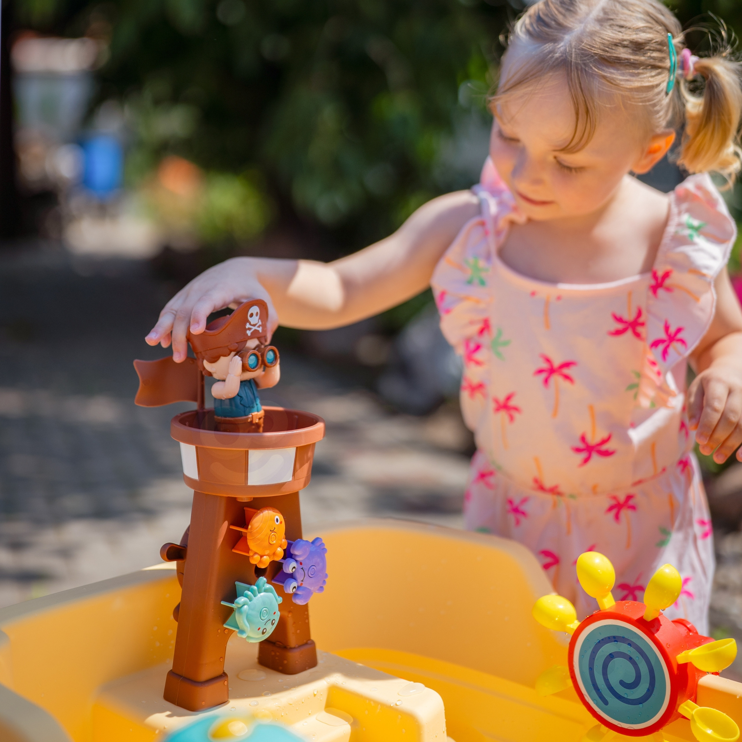 Stolik Wodny Piracka Łódź marki Woopie to niezwykła zabawka, która przenosi dzieci w świat pirackich przygód i zapewnia godziny kreatywnej zabawy na świeżym powietrzu. Dzięki bogatemu zestawowi kolorowych akcesoriów, ruchomym elementom i pirackiej wieży maluchy mogą eksperymentować z wodą, bawić się bąbelkami, kręcić kołem wodnym i odkrywać mnóstwo możliwości zabawy. Prosta, solidna konstrukcja oraz duże rozmiary sprawiają, że stolik jest wygodny i atrakcyjny nawet dla kilku dzieci jednocześnie.