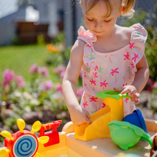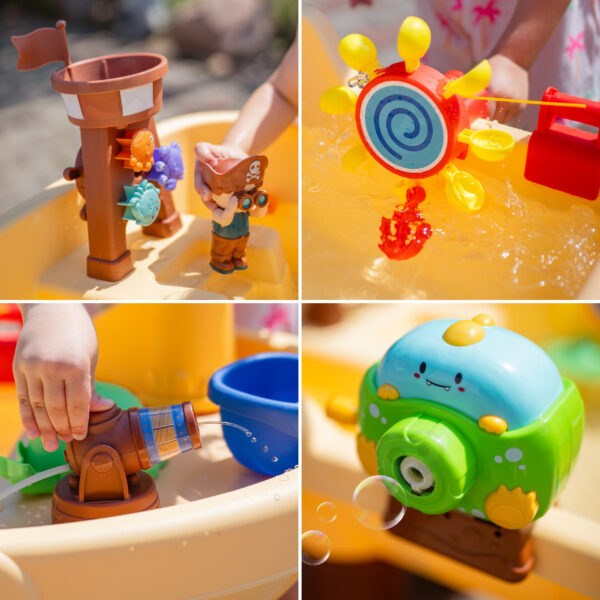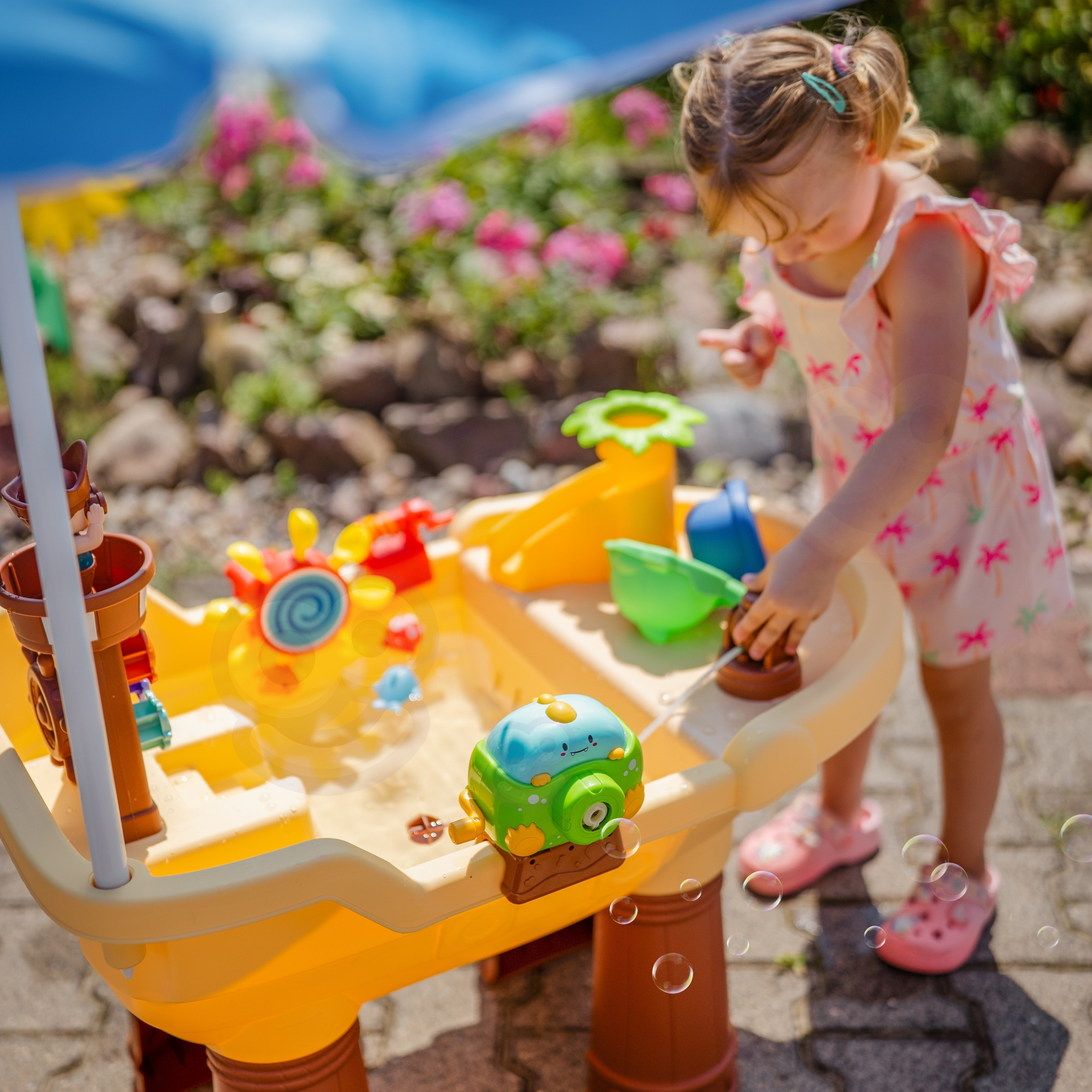 Stolik Wodny Piracka Łódź marki Woopie to niezwykła zabawka, która przenosi dzieci w świat pirackich przygód i zapewnia godziny kreatywnej zabawy na świeżym powietrzu. Dzięki bogatemu zestawowi kolorowych akcesoriów, ruchomym elementom i pirackiej wieży maluchy mogą eksperymentować z wodą, bawić się bąbelkami, kręcić kołem wodnym i odkrywać mnóstwo możliwości zabawy. Dołączony parasol pozwoli na komfortową zabawę w nawet najgorętsze dni. Prosta, solidna konstrukcja oraz duże rozmiary sprawiają, że stolik jest wygodny i atrakcyjny nawet dla kilku dzieci jednocześnie.