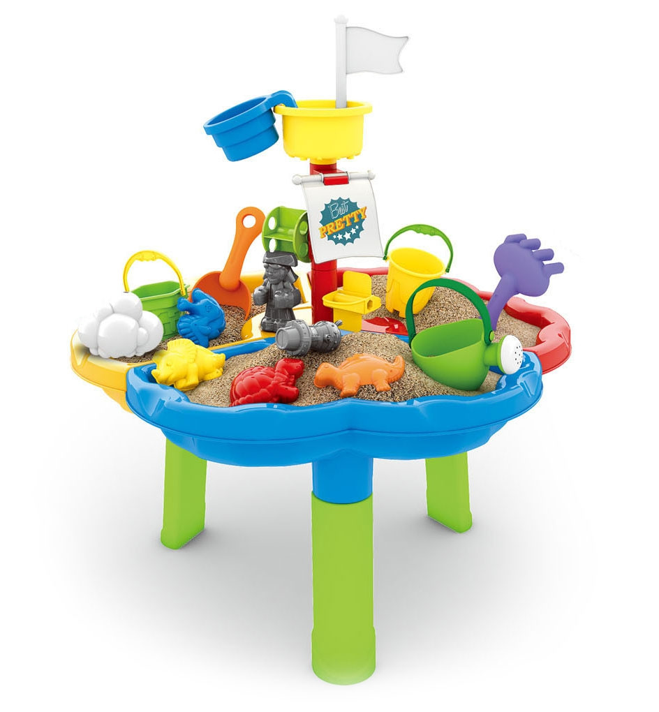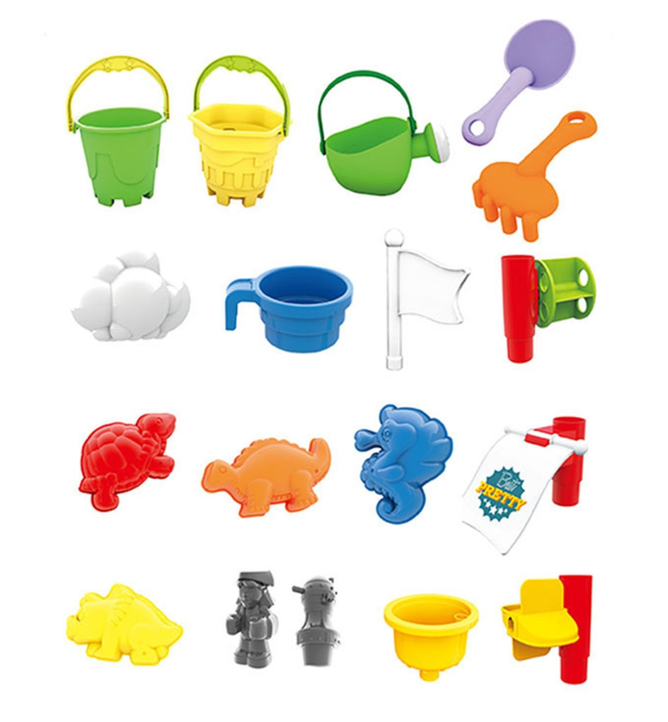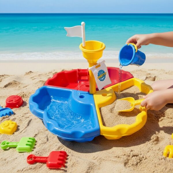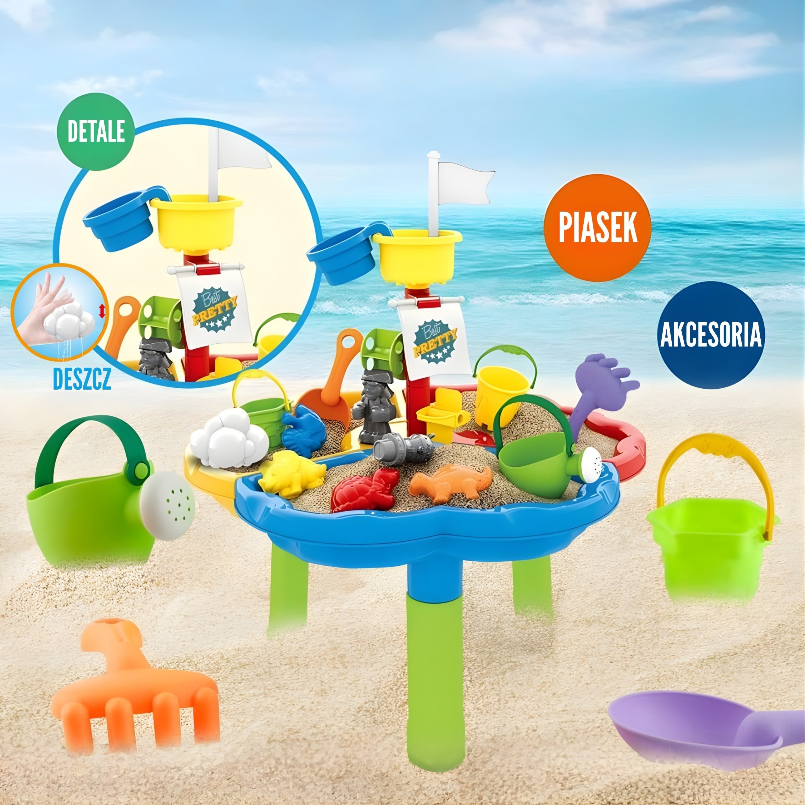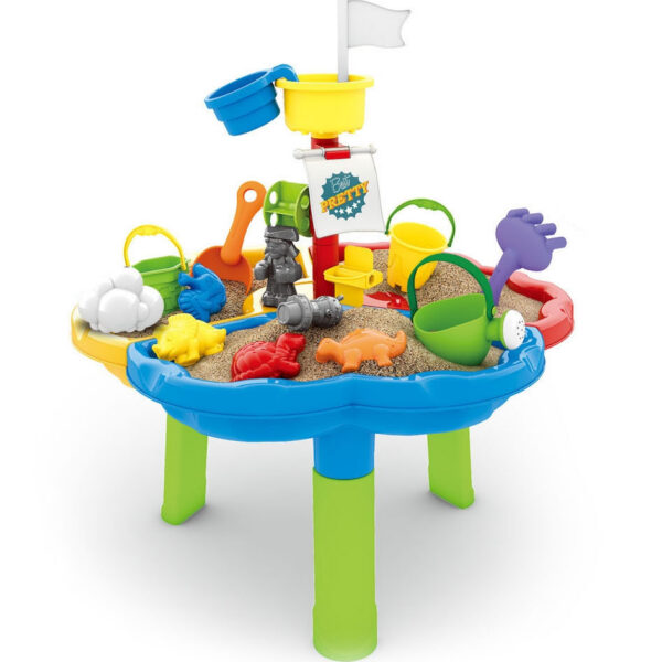 Stolik został podzielony na trzy sekcje – osobno na wodę, piasek i przestrzeń do zabawy. Dodatkowe 13 akcesoriów zapewnia jeszcze więcej frajdy! Zestaw świetnie sprawdzi się zarówno w domu, jak i na świeżym powietrzu – np. na plaży czy w ogrodzie.