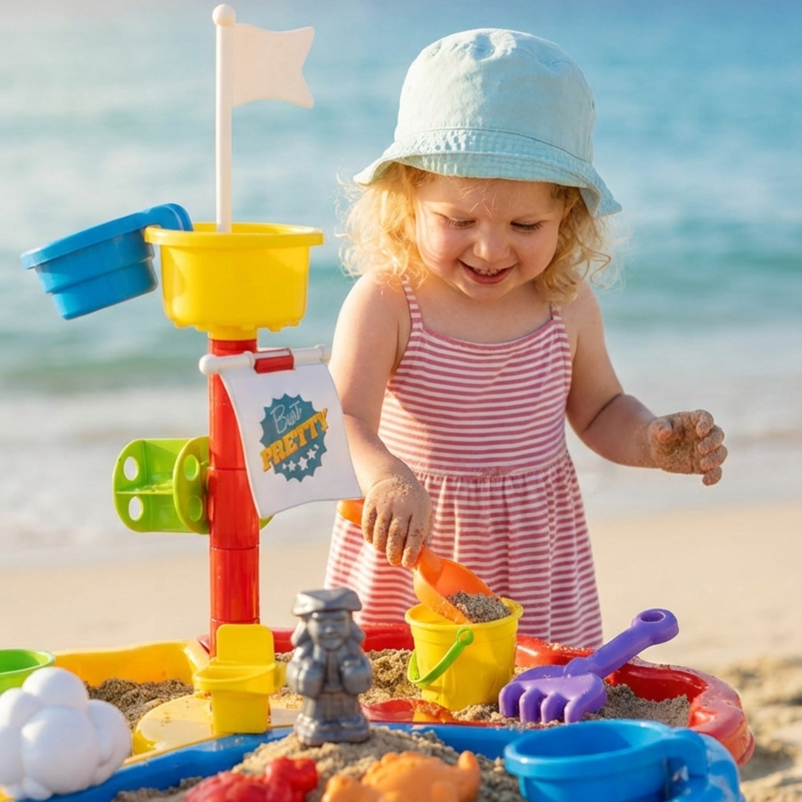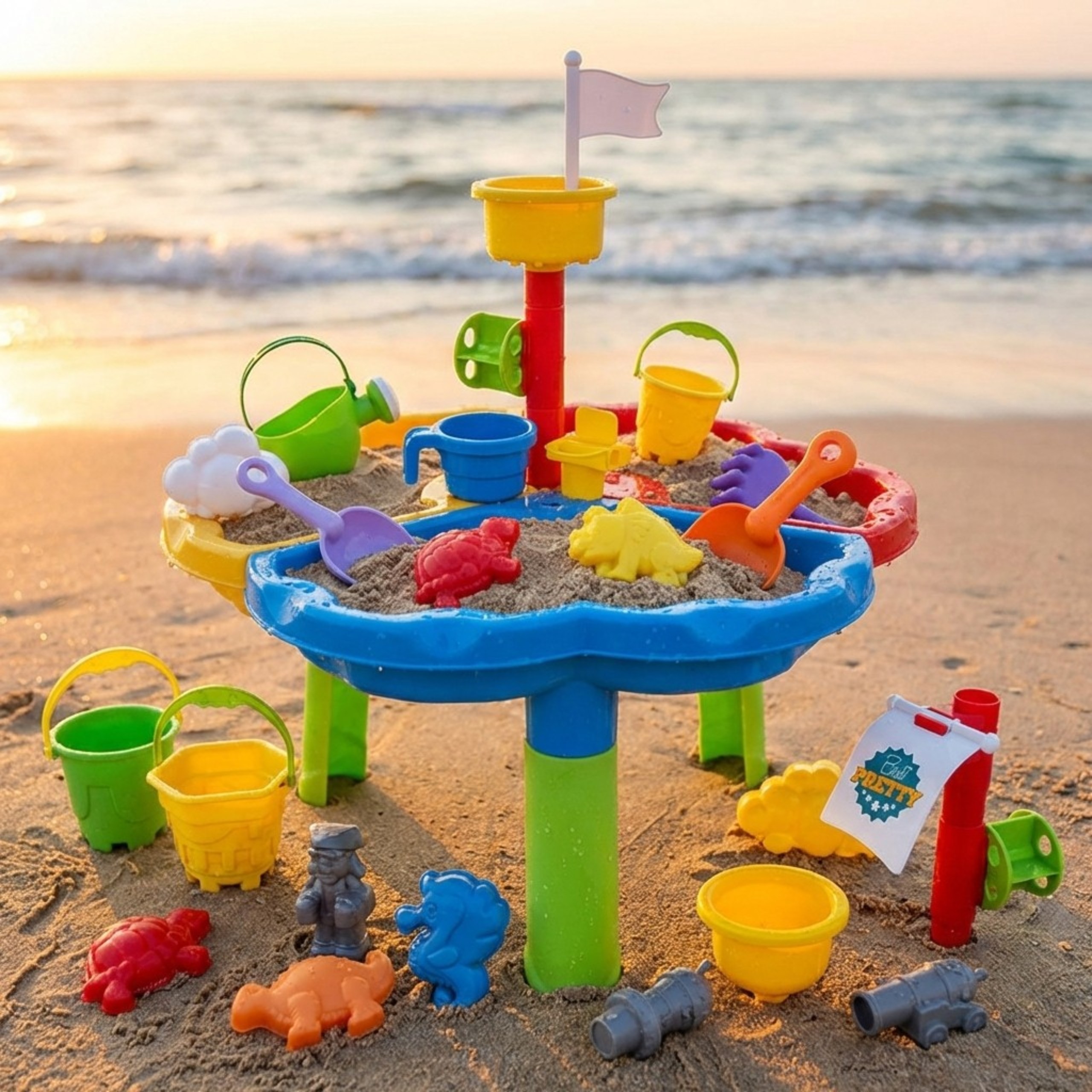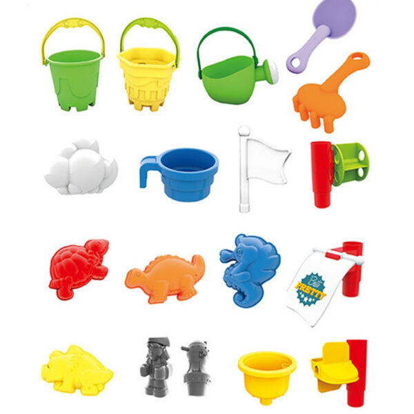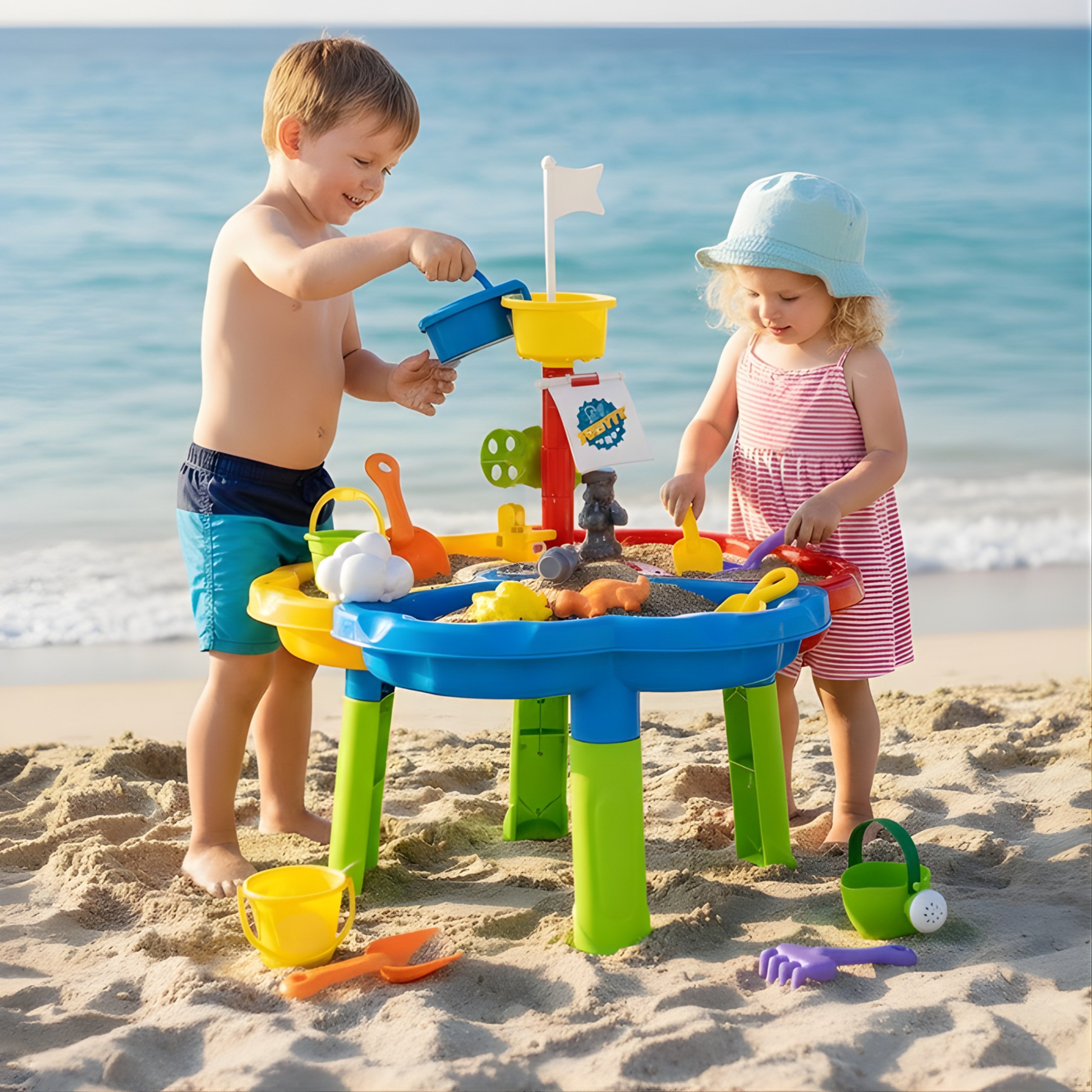 Stolik został podzielony na trzy sekcje – osobno na wodę, piasek i przestrzeń do zabawy. Dodatkowe 13 akcesoriów zapewnia jeszcze więcej frajdy! Zestaw świetnie sprawdzi się zarówno w domu, jak i na świeżym powietrzu – np. na plaży czy w ogrodzie.