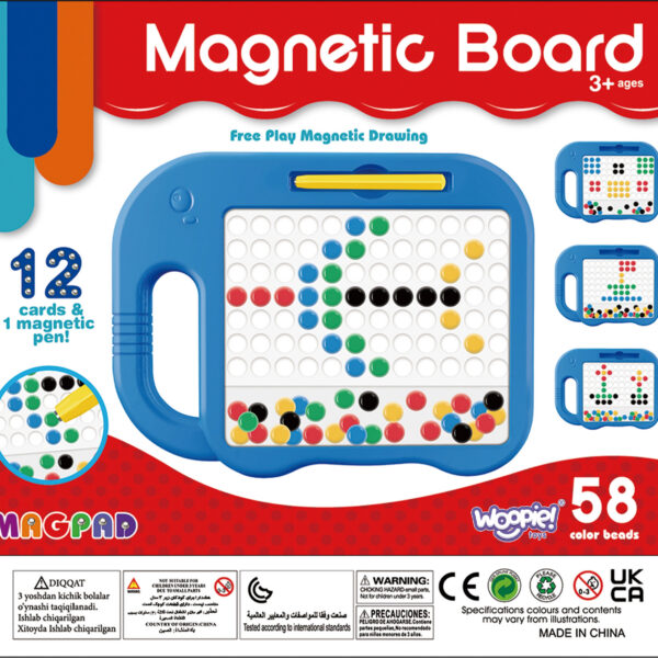 Tablica Magnetyczna MagPad od marki WOOPIE otwiera przed Twoim dzieckiem drzwi do świata kreatywności i edukacji. Dzięki tej wyjątkowej tablicy Twoje dziecko ma okazję tworzyć niepowtarzalne wzory i mozaiki. W skład zestawu, oprócz samej tablicy, wchodzi magnetyczny pisak oraz 84 magnetycznych guzików do tworzenia. Ograniczeniem jest jedynie wyobraźnia i kreatywność – maluch może swobodnie układać wzory według własnych pomysłów. Guziki są mocne i trwałe, a układanie jest intuicyjne i proste. Ten zestaw to nie tylko zabawa, ale też doskonałe narzędzie do nauki i rozwijania zdolności manualnych, koncentracji oraz wyobraźni.