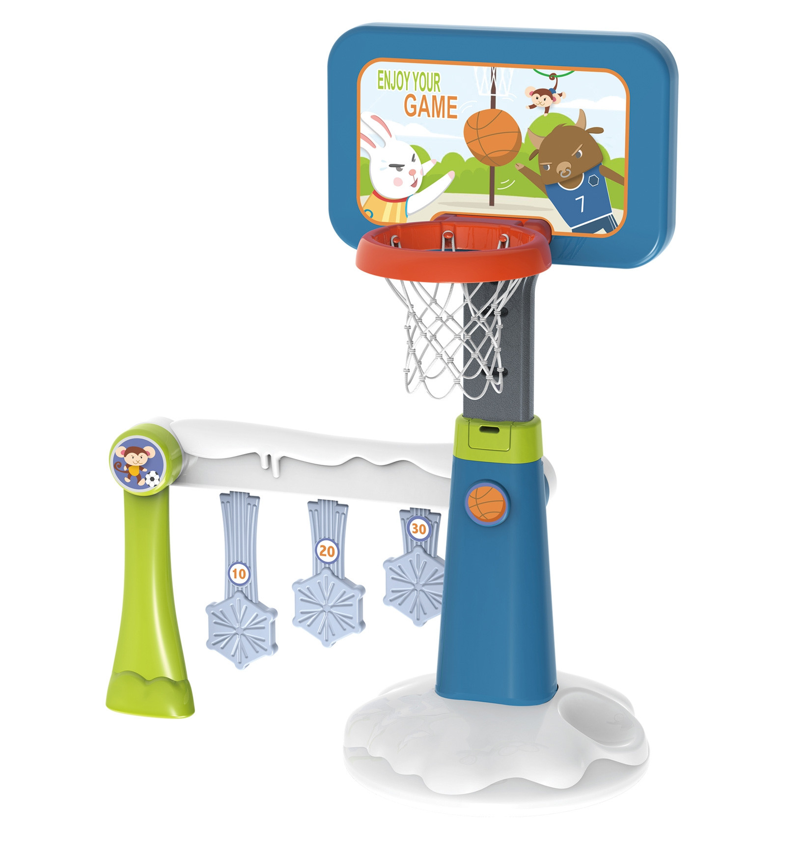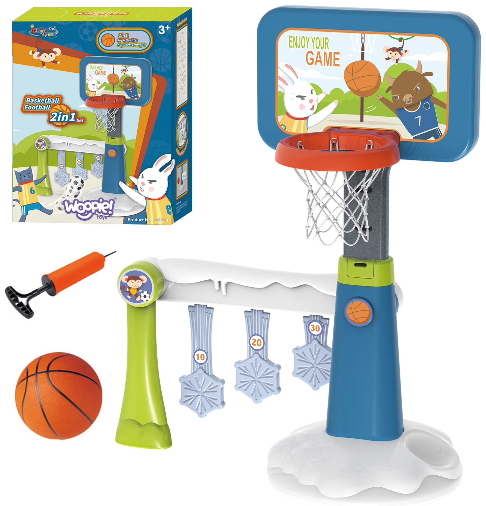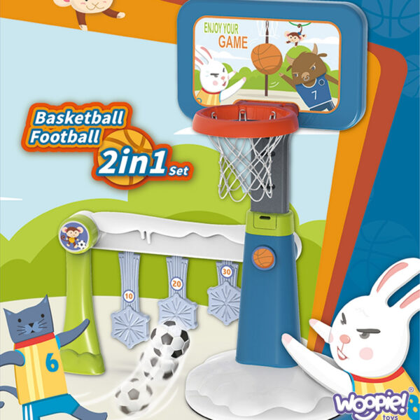Zestaw sportowy 2w1 koszykówka i bramka marki Woopie jest super połączeniem sportowym dla najmłodszych dzieci! Dziecko może wybrać w co w danej chwili chce zagrać. Dziecko może grać samo w koszykówkę lub z przyjaciółmi w piłkę nożną – nigdy nie będzie się nudzić! W bramce znajduje się tarcza z punktacją, kto ustrzeli największą liczbę punktów – wygrywa. Zestaw na pewno zachęca Twoje dziecko do uprawiania sportu. Aktywność dostarczy twojemu dziecku rozwój tzw. dużej motoryki, co jest idealne dla prawidłowego rozwoju dziecka. Wielkim plusem jest to, że produkt może być używany zarówno w domu jak, i na zewnątrz – Twoje dziecko będzie mogło grać wszędzie bez względu na pogodę. Koszykówka jest wysokości 125 cm – doskonała dla najmłodszych graczy!