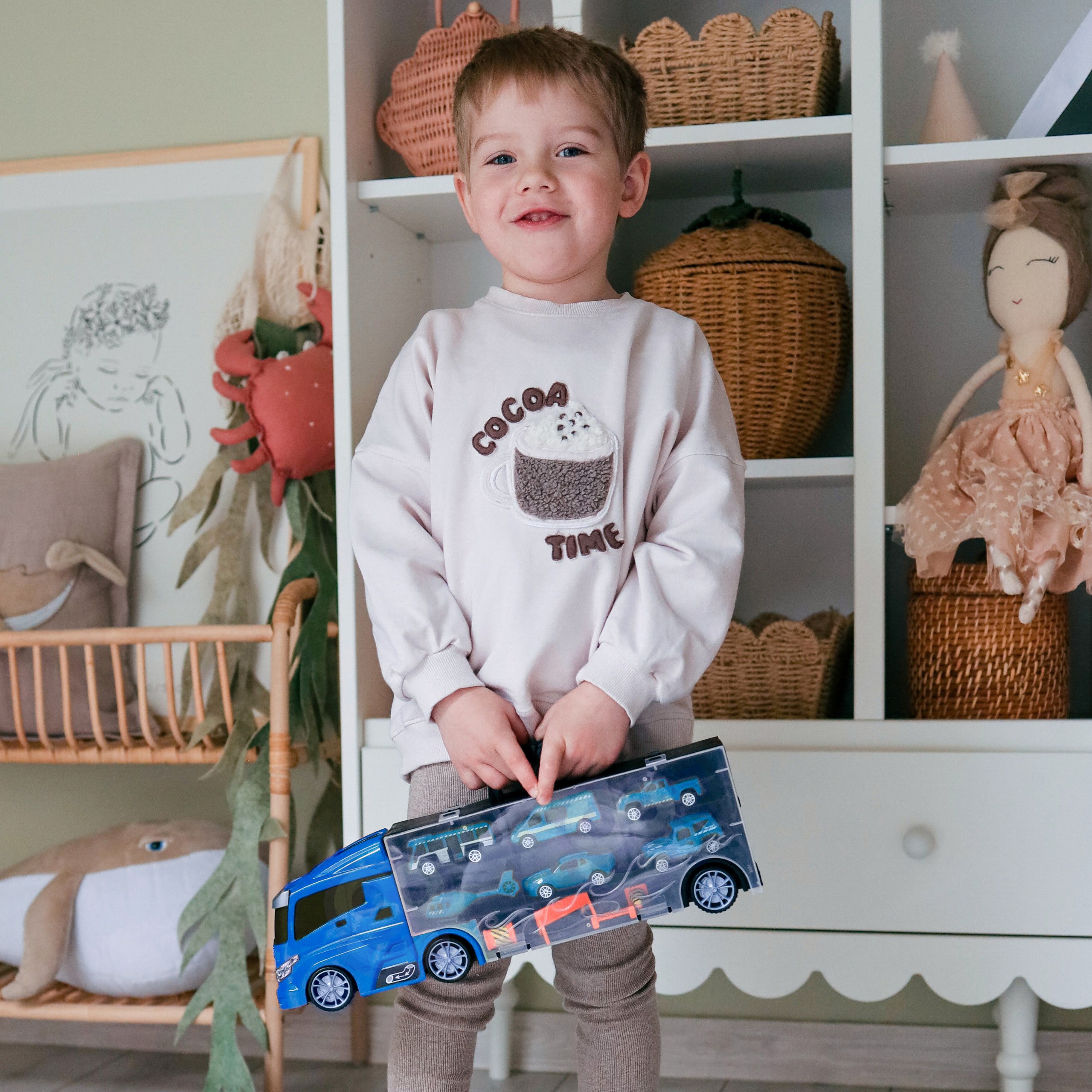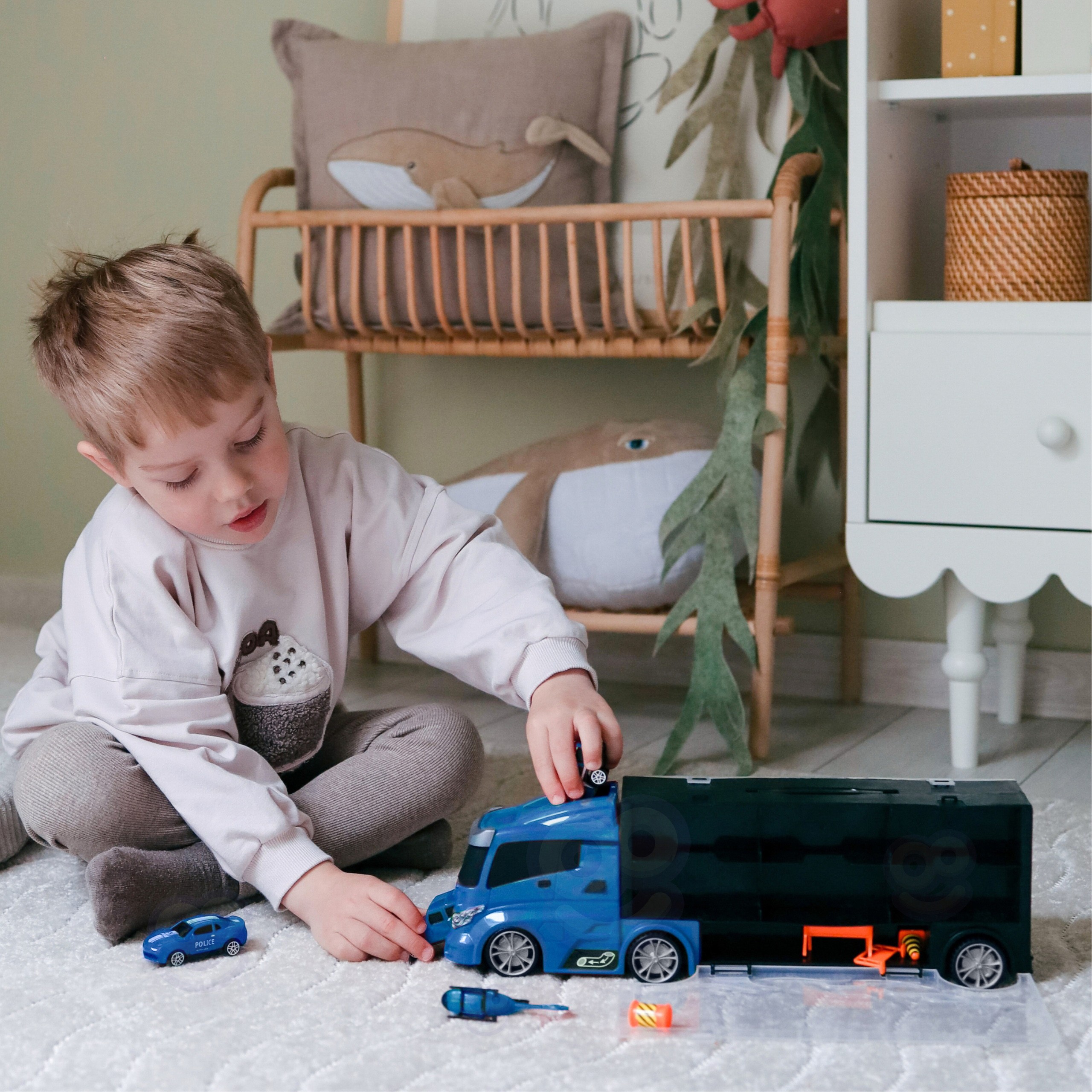 Ciężarówka 3w1 Policja od marki WOOPIE To idealna zabawka dla każdego małego fana pojazdów Policji, transportu i akcji! Zestaw składa się z dużej lawety TIR, która pomieści w sobie aż 4 samochody Policyjne, helikopter oraz dodatkowe znaki ostrzegawcze, które dodają realizmu zabawie. Dzięki wyrzutni umieszczonej na lawetcie, dzieci mogą wysunąć samochody i wystrzeliwać je na różne odległości. Laweta ma aż 40 cm długości, co sprawia, że jest wystarczająco duża, by pomieścić wszystkie pojazdy i akcesoria. Zestaw doskonale rozwija wyobraźnię dziecka, pomagając w tworzeniu własnych scenariuszy zabawy. Dzięki znakom ostrzegawczym mogą uczyć się podstaw bezpieczeństwa na drodze, co czyni zabawę zarówno edukacyjną, jak i pełną emocji.