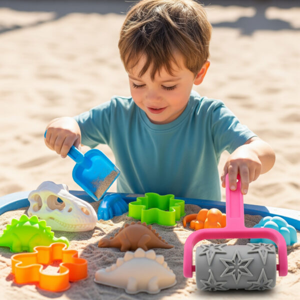 Zestaw do Piasku Dinozaury Wykopalisko od marki WOOPIE to świetny dodatek do piaskownicy, a nawet ogrodu. Zestaw zawiera 9 elementów: czaszkę dinozaura, 4 foremki, łopatkę, pazury do piasku, konewkę oraz walec. Zabawki wykonane są w motywie dinozaurów i mogą być wykorzystane do zabawy w małego archeologa. Gwarancja super zabawy w piaskownicy, na plaży, a nawet w ogrodzie! Produkt przyjazny środowisku!