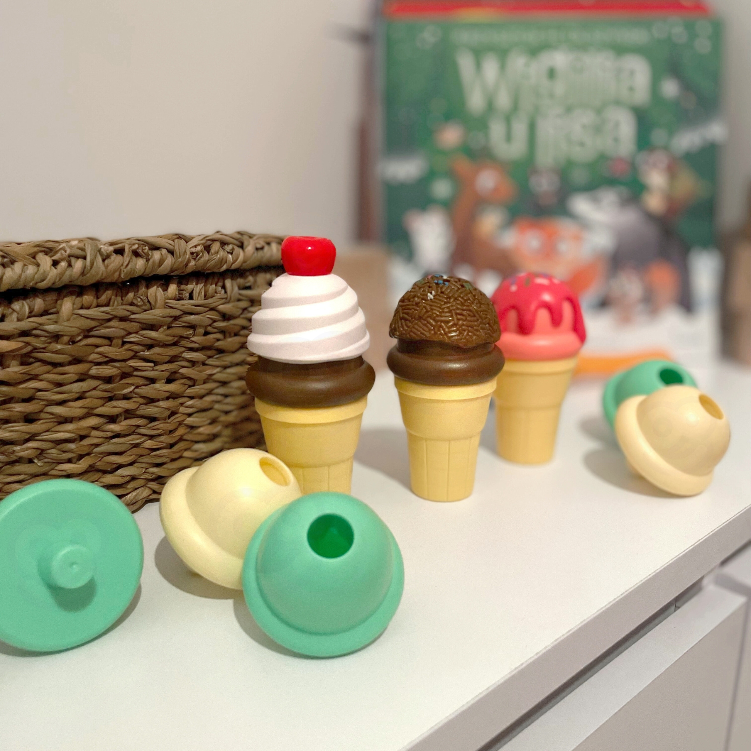 Zestaw do Robienia Lodów od marki WOOPIE pozwoli poczuć się twojemu dziecku jakby był prawdziwym cukiernikiem. W zestawie znajdują się wafelki, kulki, łyżkę do nakładania i extra dodatki. Dziecko bierze wafelek, nakłada na łyżkę dowolną gałkę i układa według swojego uznania. Prosta zabawa, a pozwoli rozwinąć wyobraźnie i kreatywność Twojego dziecka. Dziecko może wcielić się i odegrać role cukiernika i klienta z przyjaciółmi lub rodziną.