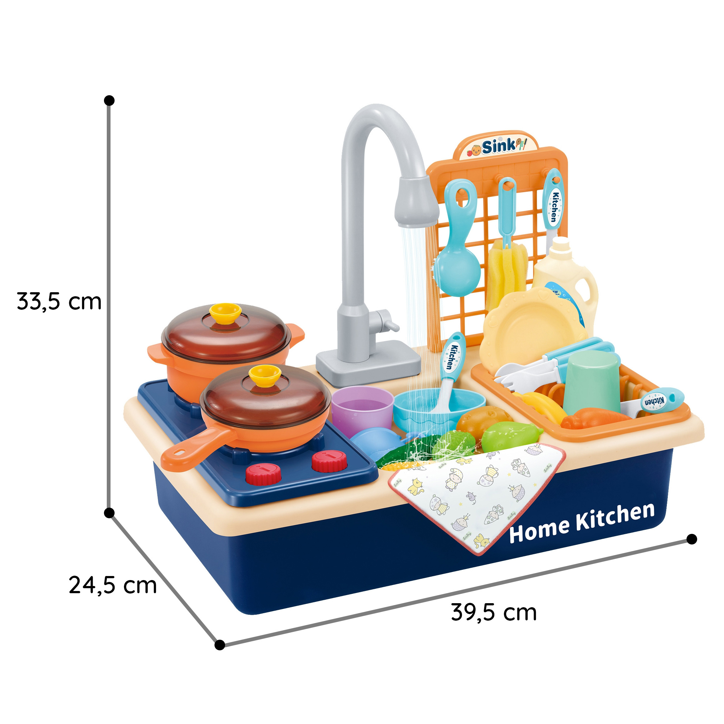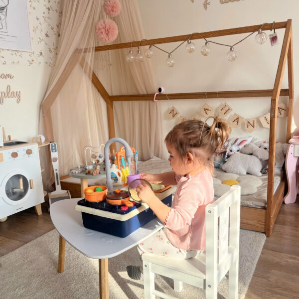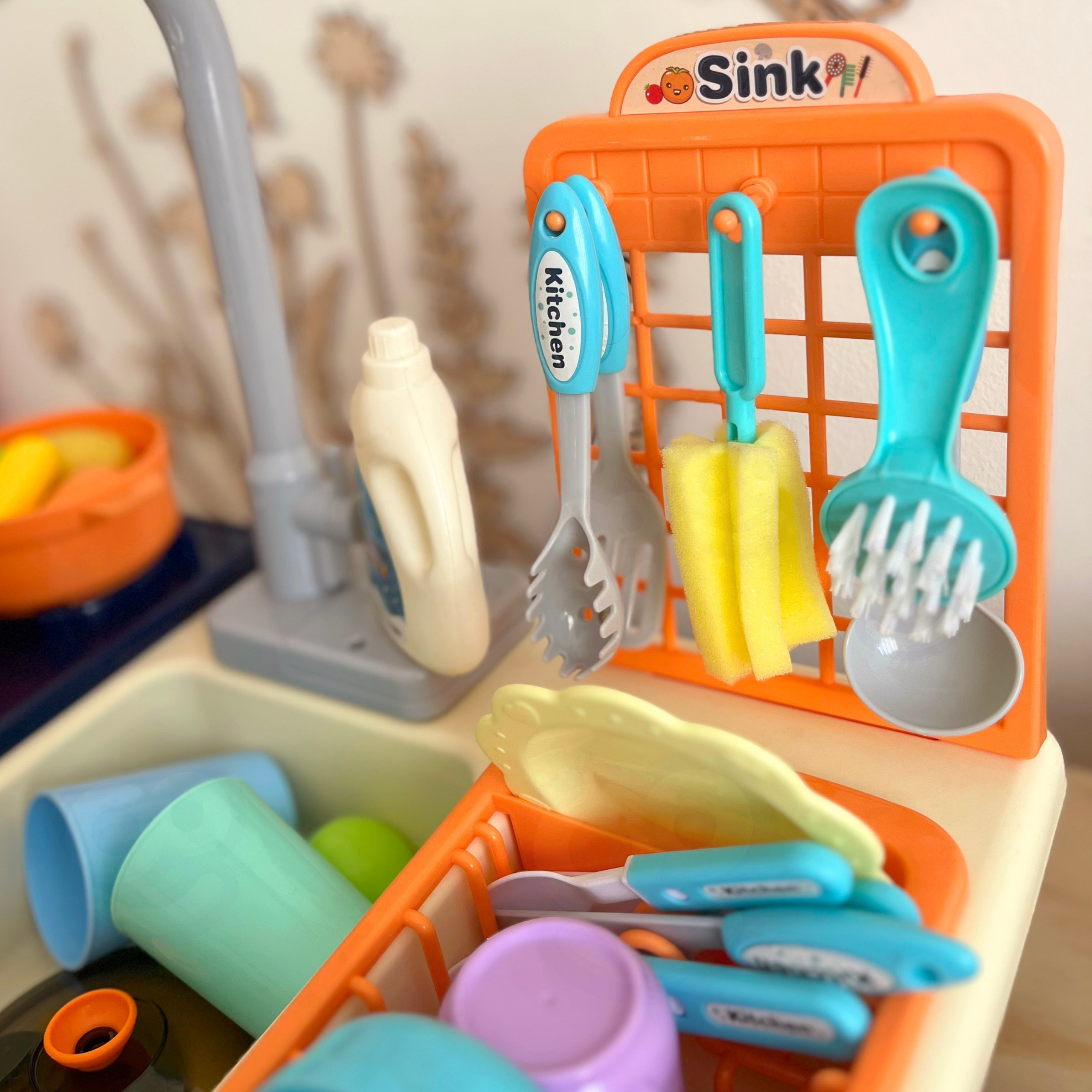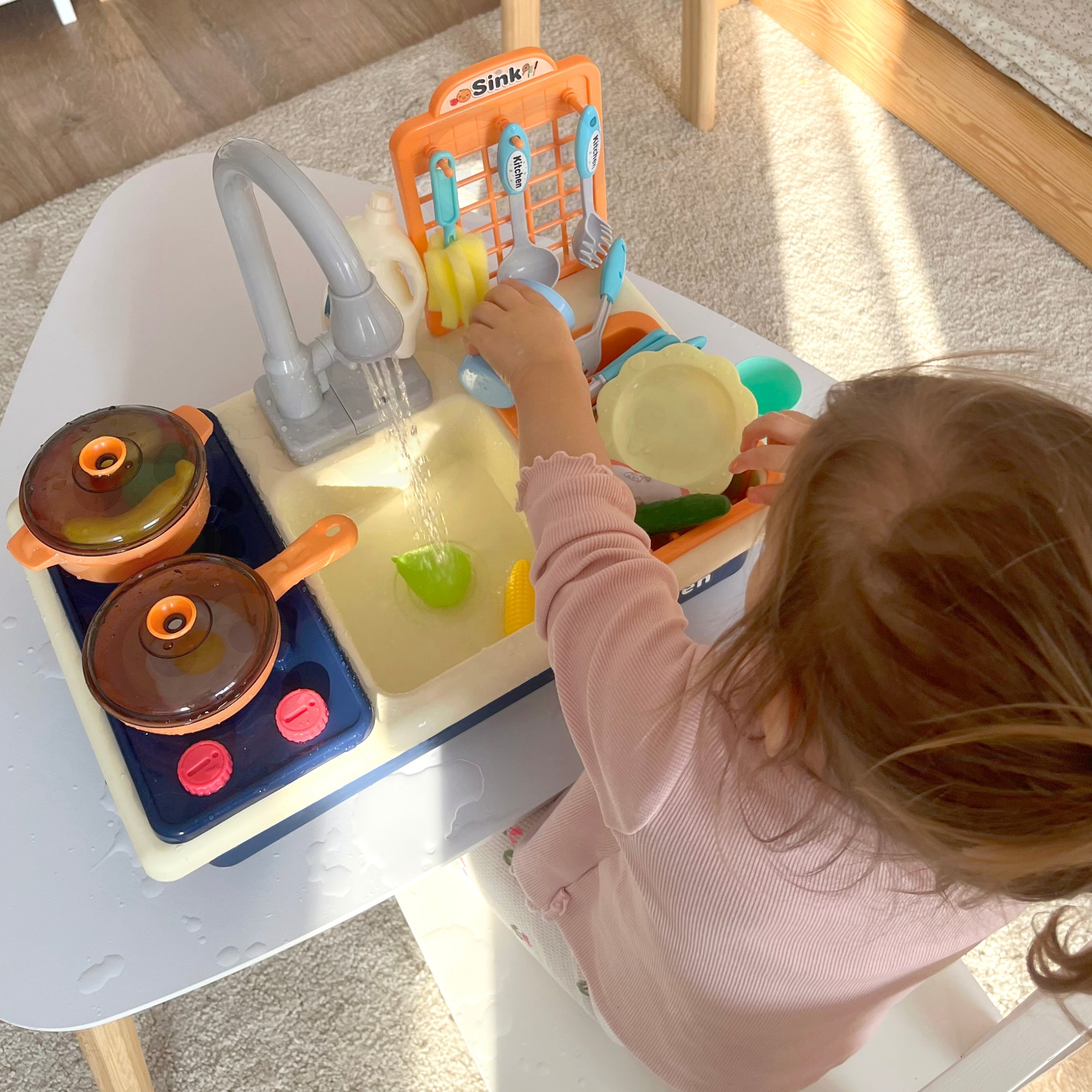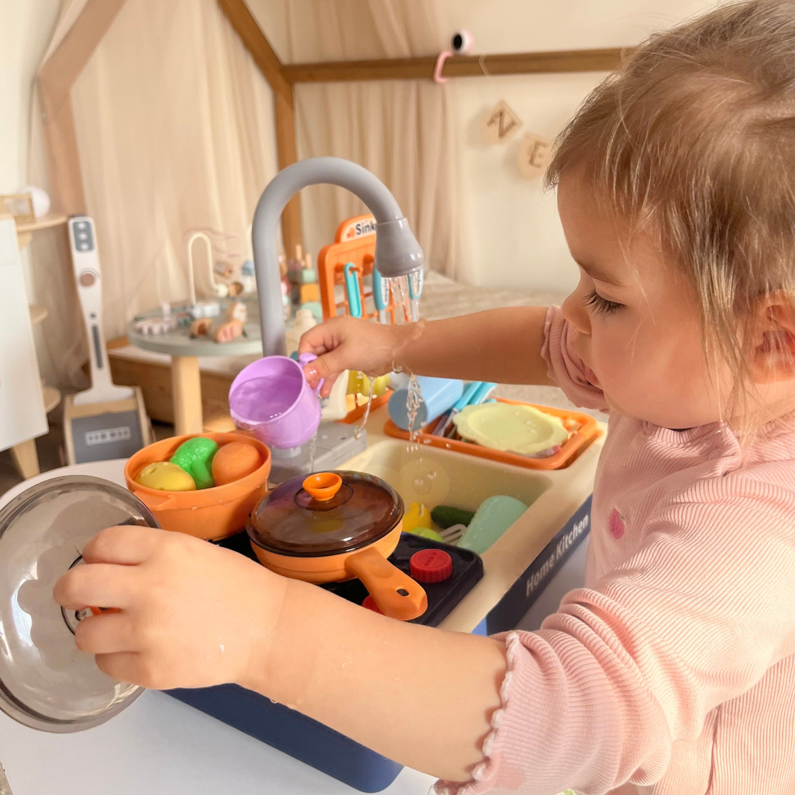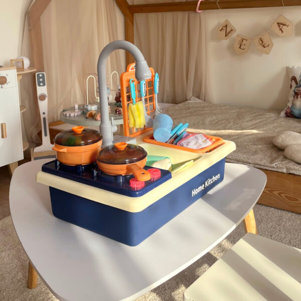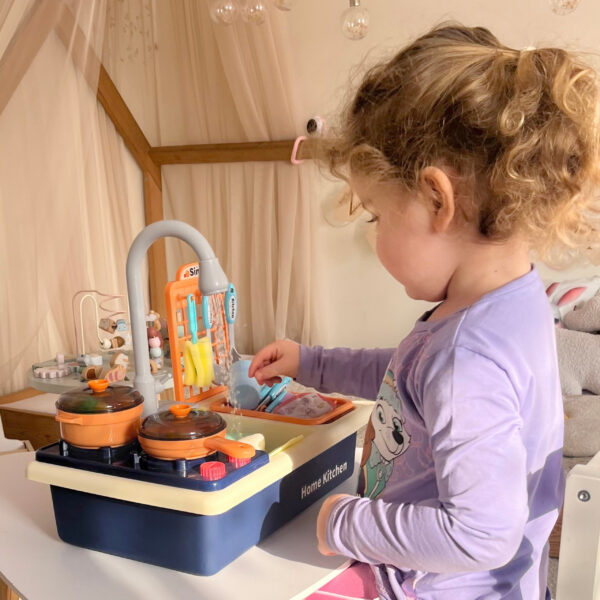 Zlewozmywak Kuchenka 2w1 od marki WOOPIE pozwoli dzieciom gotować i zmywać naczynia tak jak ich rodzice – naśladować od najmłodszych lat! Zabawka jest doskonale odwzorowana, dzięki czemu dziecko ma wrażenie, że wykonuje prawdziwe czynności kuchenne. Posiada ruchome elementy jak kurki od kuchenki oraz kran, z którego leci prawdziwa woda. Wystarczy wlać do misy wodę i zobaczyć jak dziecko się bawi, a po wszystkim wystarczy opróżnić dolną misę. Dodatkowo, zestaw zawiera wiele akcesoriów jak garnki i artykuły spożywcze. Zabawa w gotowanie, zmywanie naczyń i wykonywanie podobnej pracy, pomaga dzieciom nabrać poczucia odpowiedzialności i samodzielności.